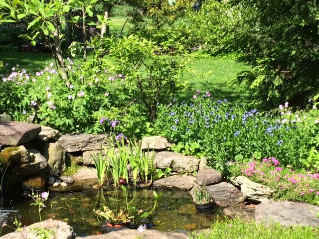 | The Blue-eyed Grass has finally settled in after 5 years or so and looks great. It works well against the bronze of the Heuchera and the Lyre-leaved Sage. |